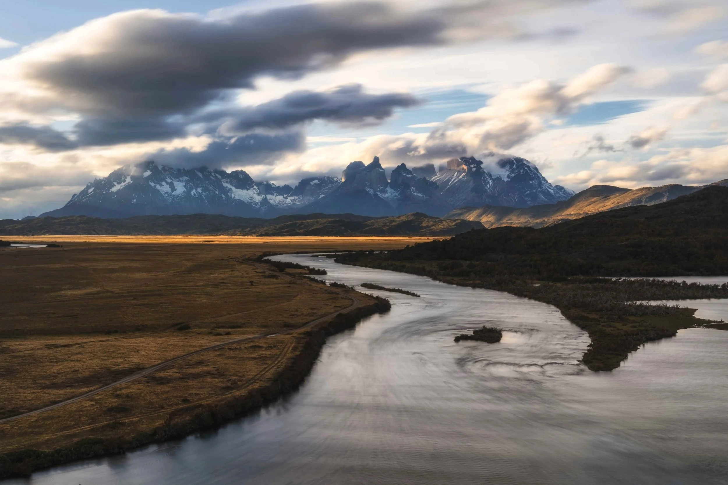 Even as the light faded, the photographic opportunities continued to amaze me. After traversing a challenging beach trail, we reached a hidden vantage point recommended by our guide, Eduardo. This spot, tucked away from the beaten path, provided an unparalleled view of a winding river leading toward majestic peaks.